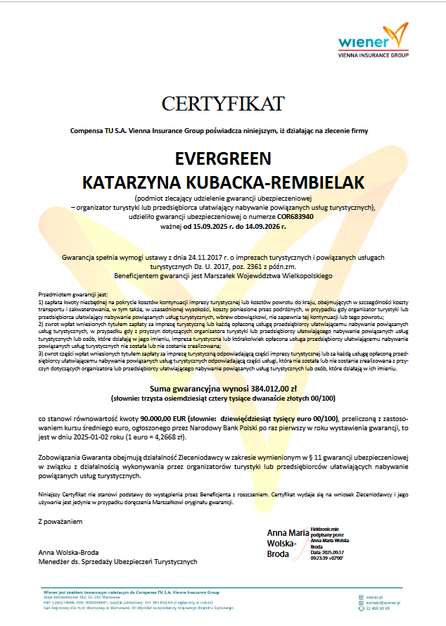 Evergreen – Egzotyczne Szlaki to oficjalnie działający organizator turystyki, wpisany do Rejestru Organizatorów Turystyki prowadzonego przez Marszałka Województwa. Oznacza to, że nasza działalność jest zgodna z wymogami prawa polskiego i unijnego (Dyrektywa UE 2015/2302), które w pełni chronią interesy podróżnych.